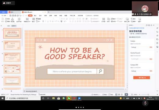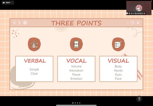 接着,2020级口译专业的陈子君就如何成为一名优秀的演讲者分享了自己的经验。她首先介绍了演讲比赛的类型,即准备演讲和即兴演讲两类。准备演讲涉及三个要素:内容简洁明了、声音沉稳有力、姿态端庄得体。即兴演讲也有三个要求:语言组织流畅、逻辑思维清晰、最重要的一点是要自信。她鼓励大家要多多参加比赛,积累经验。