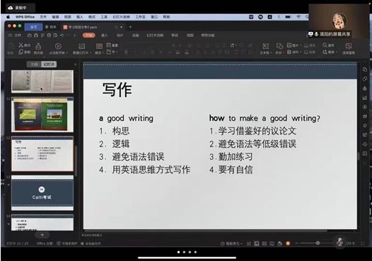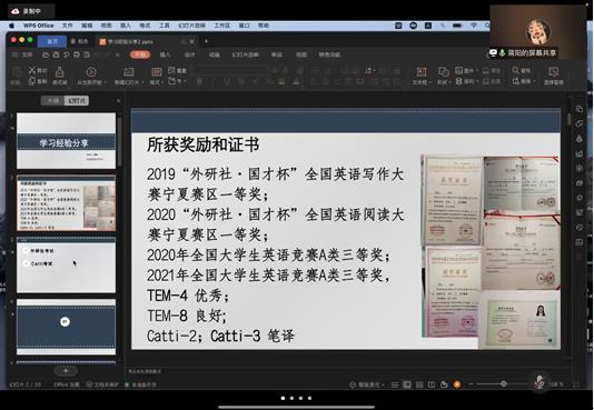首先,2019级英语语言文学专业的蒋阳向大家分享了参加外研社比赛和CATTI二级笔译考试的经验。针对外研社阅读比赛,她提到阅读英文原著可以很好地提升自己的阅读能力。针对写作比赛,蒋阳认为一篇好的写作需要完整的结构和严密的逻辑;其次要注意语言表达。关于CATTI考试,她建议要多进行针对性练习,如熟读政府工作报告之类的英译,增加知识储备。