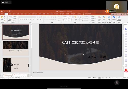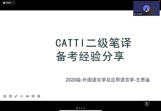 最后,2020级笔译专业的陆颖和2020级外国语言文学及应用语言学专业的王思遥分别分享了备战CATTI二级笔译的经验。其中,陆颖主要从备考资料和时间安排方面进行了分享。她指出备考资料可以参考纸质资料和电子资料。王思遥主要介绍了CATTI考试的内容和形式,给同学们建立起了一个整体框架。同时,她建议大家要留足备考时间,备考书目也要有针对性,还要善于总结经验、及时复习。