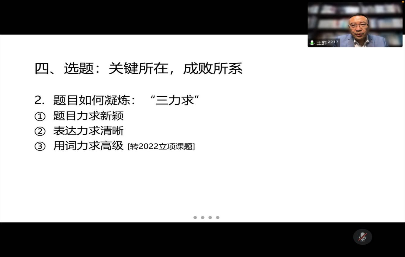 王辉教授的讲座中既有宏观层面的政策解读,也有微观层面的细节分析,既有申报者视角中需要注意的问题,又有评阅者视角中的阅读感受分享,整个讲座点面结合,重点突出,开拓了与会者的学术思路,增强了与会者的申报信心。