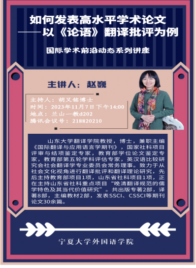 邀请山东大学翻译学院赵巍教授开展了题为“如何发表高水平学术论文——以《论语》翻译批评为例”的讲座。本次讲座由英语系副主任胡又铭博士主持,kk体育