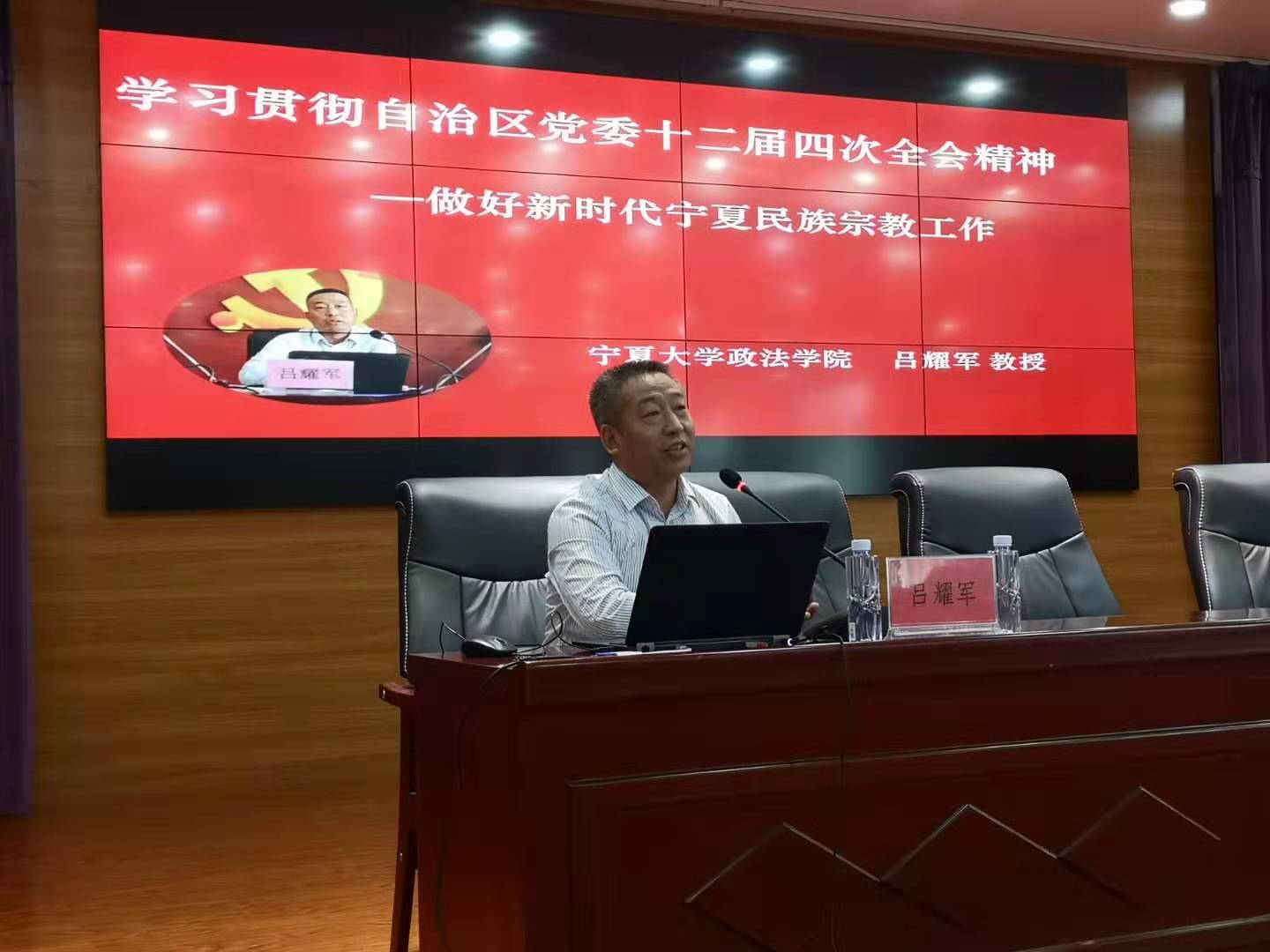 吕耀军教授以《学习贯彻自治区党委十二届四次全会精神——做好新时代宁夏民族宗教工作》为题,紧紧围绕自治区党委十二届四次全会会议内容,从全面认识全会的重大意义、准确把握全会精神实质、把全会精神落到实处三个方面,结合一些典型案例,进行了深入浅出的讲解,语言生动、内涵深刻。