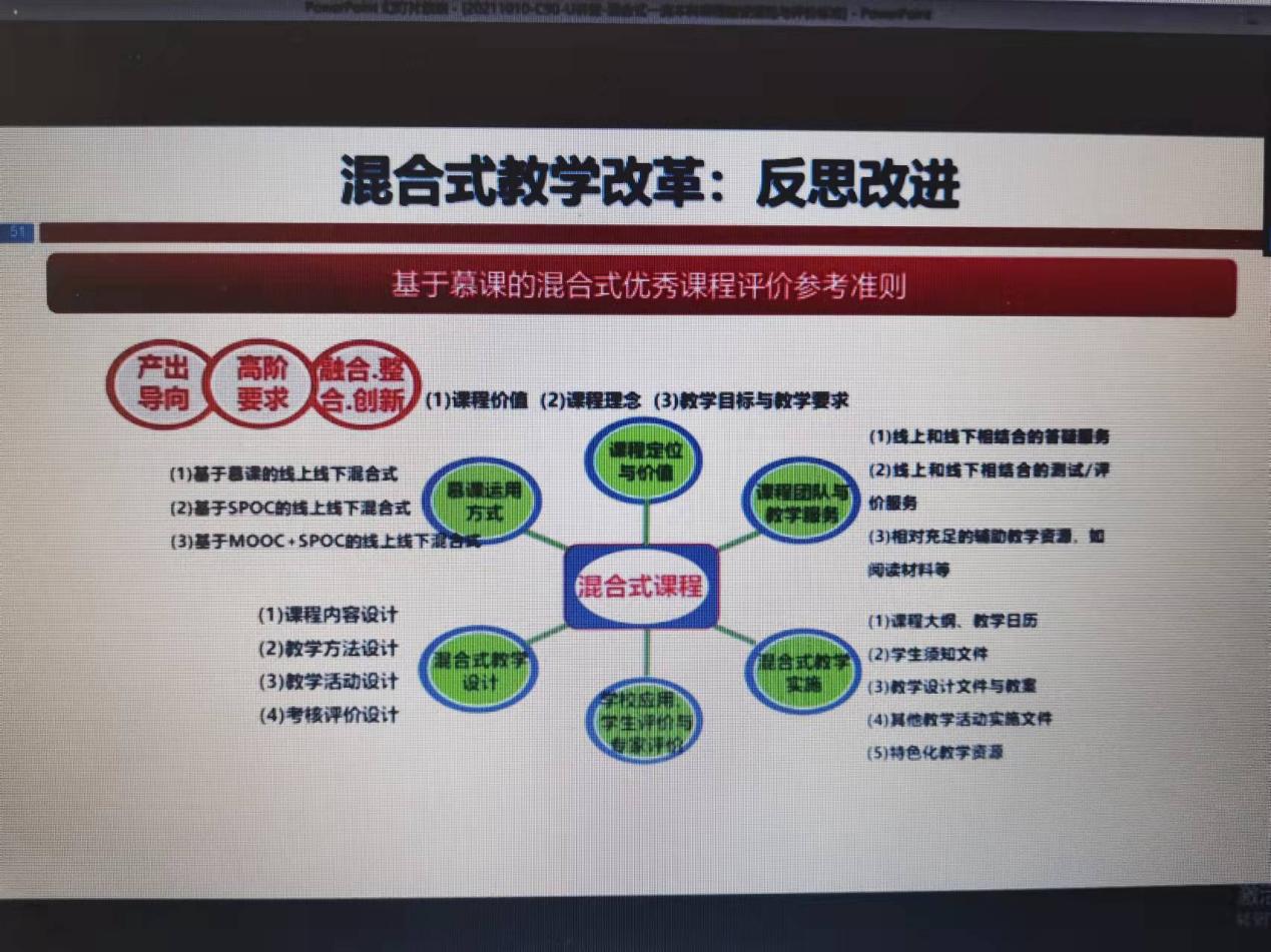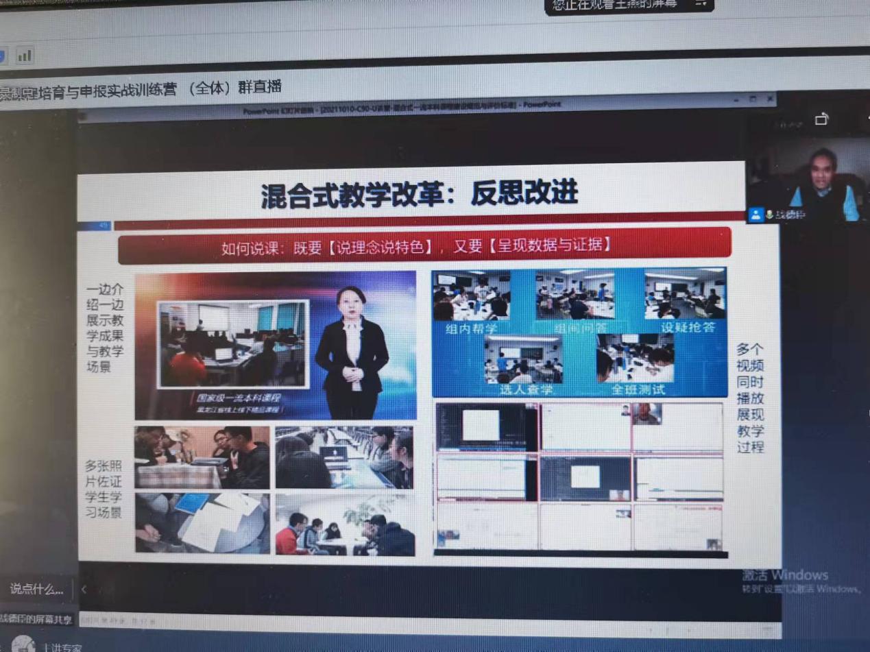 英语系一流基层教学组织“语言与思辨教研室”于2021年10月27日下午2点,开展了线上教学活动,共同观看讲座“混合式一流本科课程建设规范及评价标准”,主讲人为哈尔滨工业大学教授,博士生导师战德臣。英语系语言与思辨教研室(一年级组)和语言与思辨教研室(二年级组)全体教师共同聆听本次线上讲座。