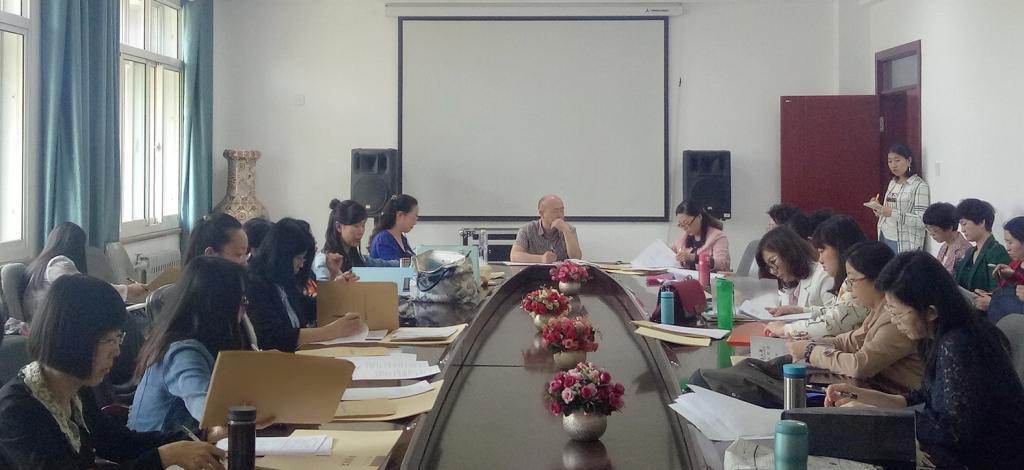答辩会开始之前,英语系刘燕老师对答辩小组人员组成、场地设置和答辩过程细节进行安排与调整。