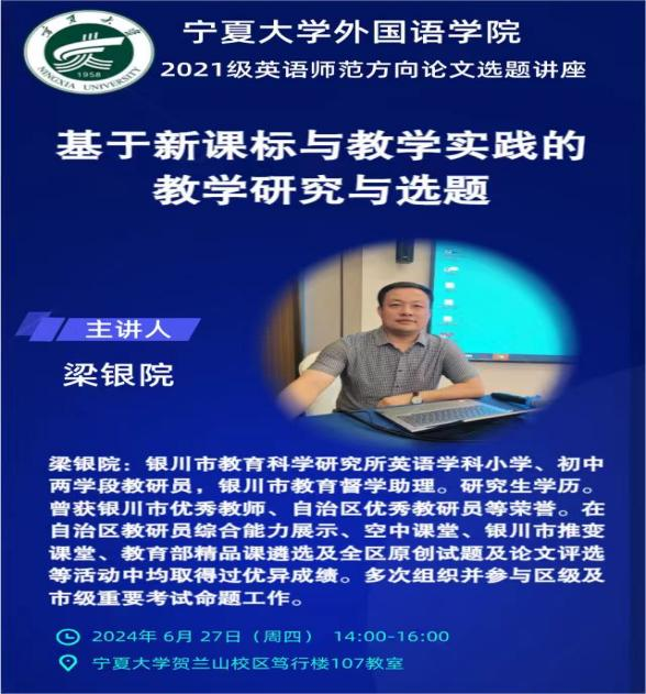 英语教师教育专业本科生的学术素养和论文写作能力,促进师范生培养质量提升,2024年6月27日,学院邀请银川市教育科学研究所英语学科教研员、银川市教育督学助理梁银院老师,开展了“基于新课标与中学英语教学实践的论文选题”讲座,2021级全体师范生参加了讲座。