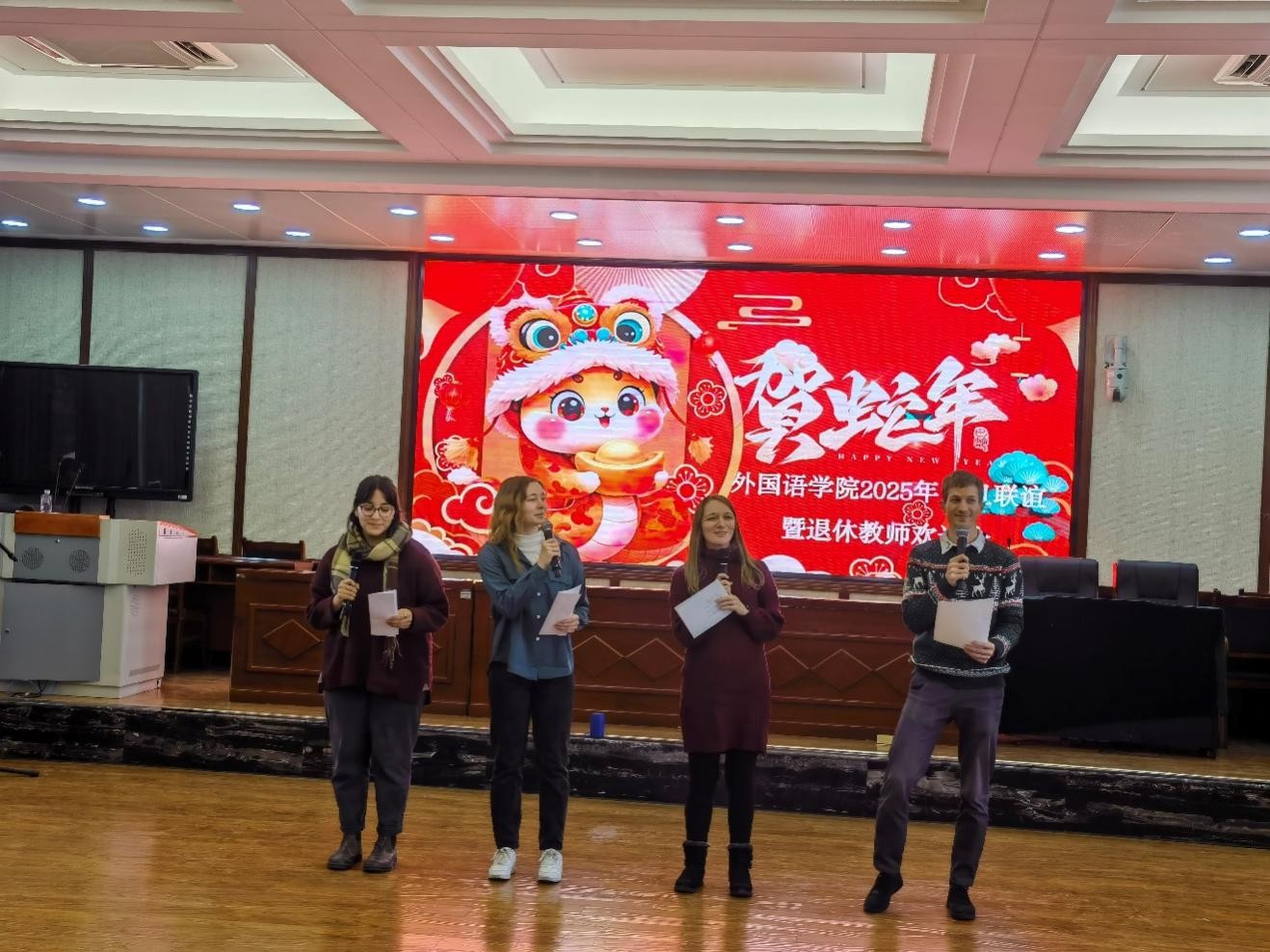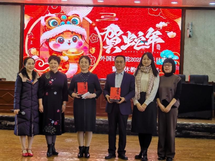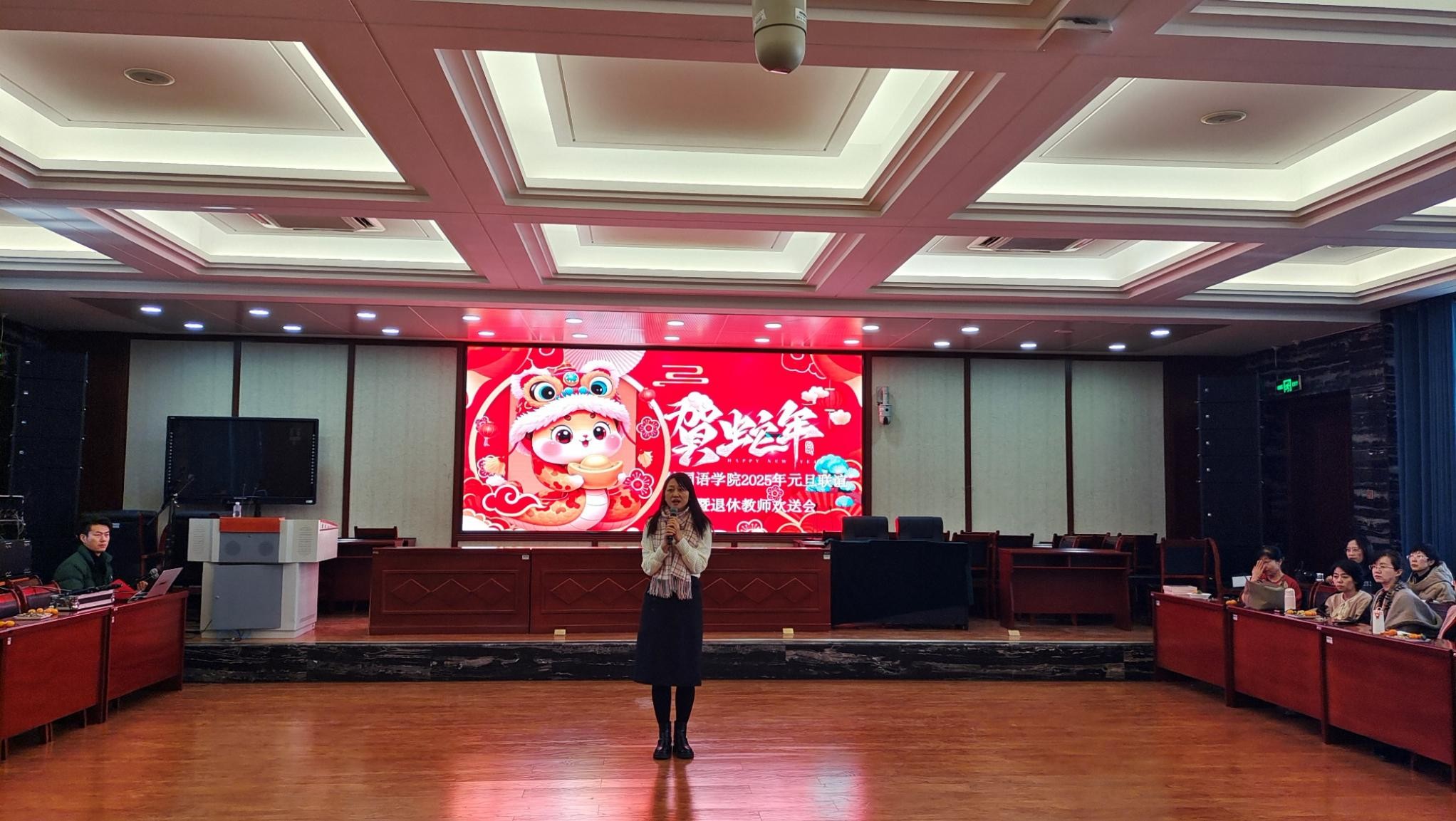 在怀远校区逸夫楼一楼报告厅举办“辞旧迎新,共话友情”新年师生联谊会。学院党政领导、教师职工百余人欢聚一堂,共同庆祝2025年新年的到来。联谊会由学院工会主席闻晖老师主持。