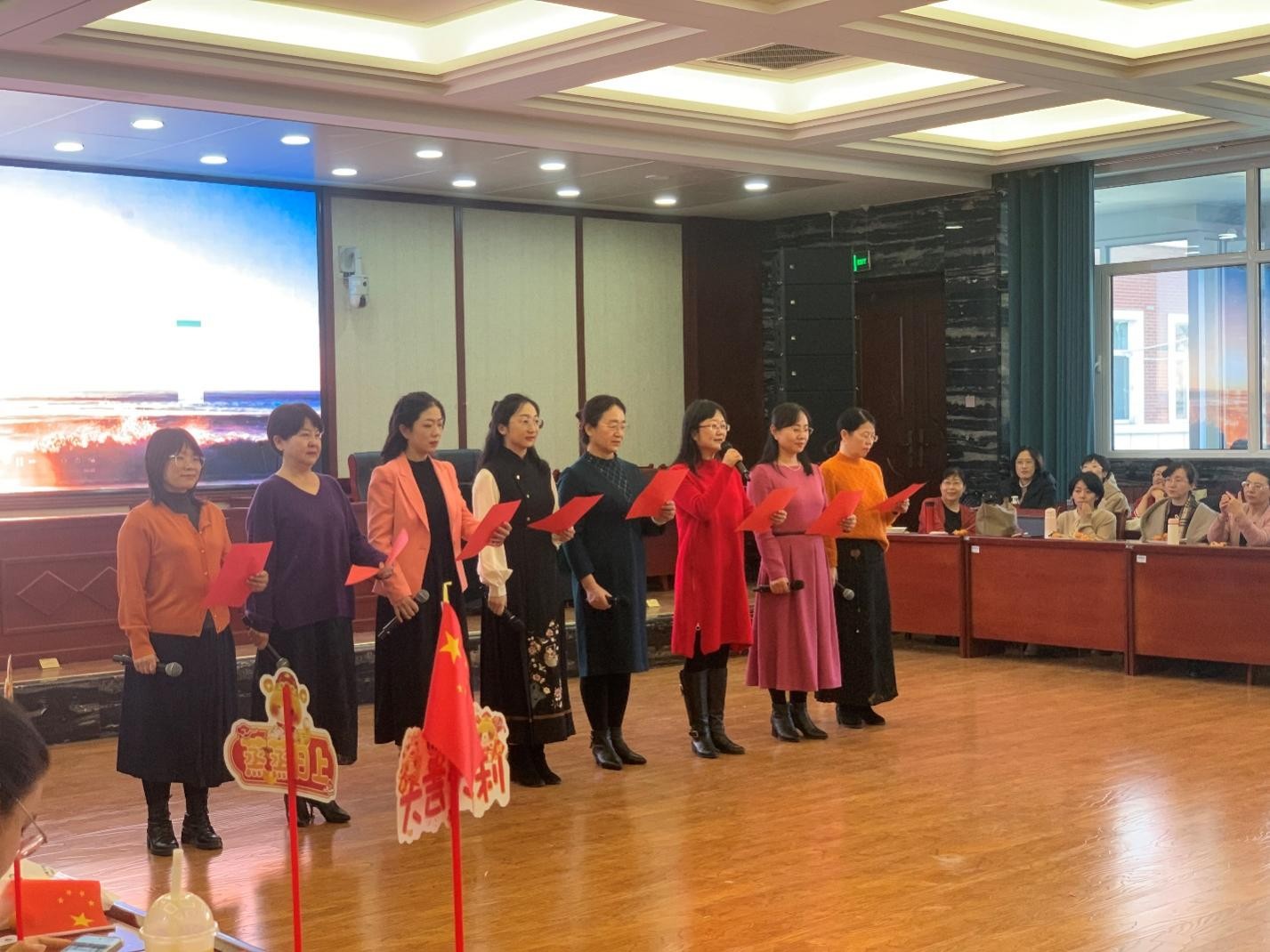 最后,以王奕文老师为代表的诗朗诵《我爱你中国》以及全体教职工参与的大合唱《我和我的祖国》将整场联谊会推向了高潮。