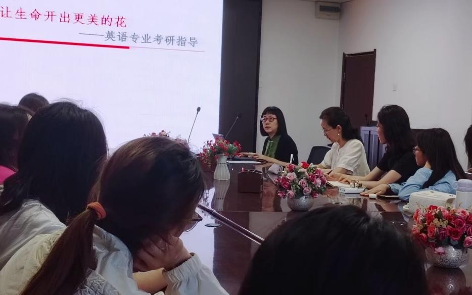 为助力学生明晰学业规划,提升考研保研竞争力,5月22日下午,2024级英语师范一班在逸夫楼307会议室开展了题为“让生命开出更美的花”的主题班会。会议由班主任文莉老师主持,学院副院长胡笑瑛教授担任主讲嘉宾,2024级英语师范一班全体同学参加会议。
