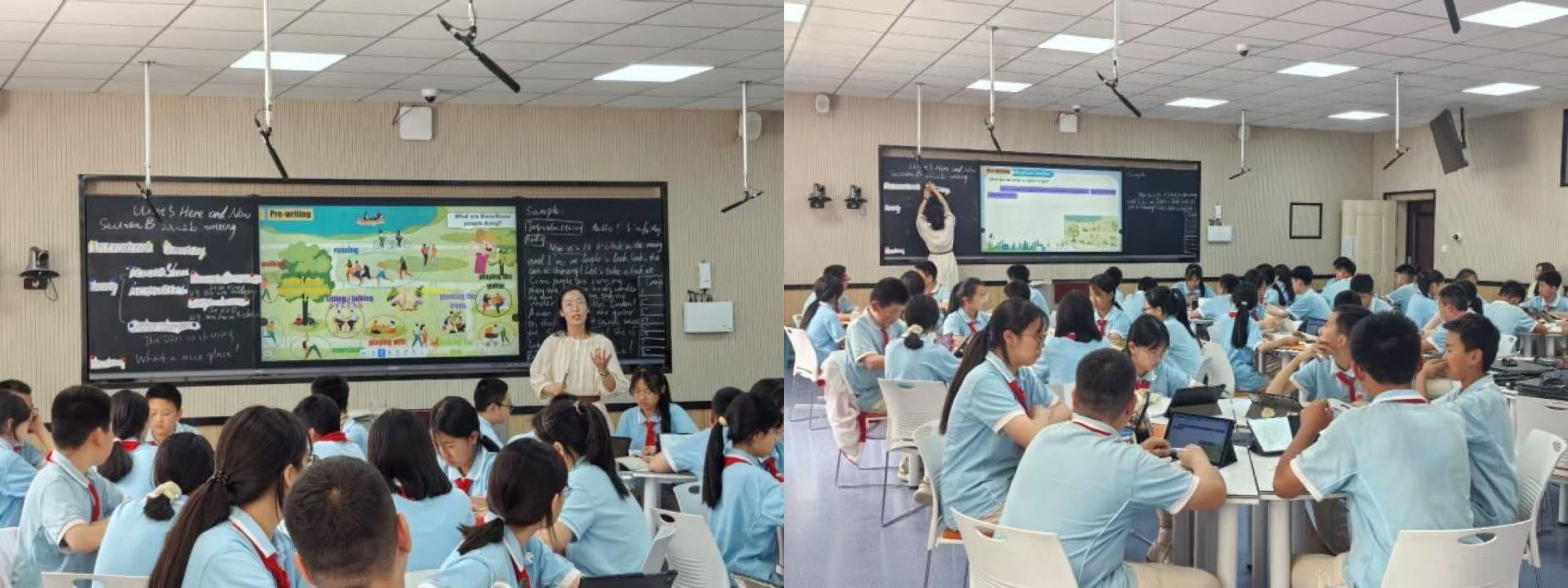 附属中学开始本次见习活动。此次活动中,师范生观摩了杨静雪老师的授课,其授课内容选自Unit 5 Here and Now Section B 2a~2b。杨老师选取公园场景,向同学们讲述了如何撰写视频脚本。