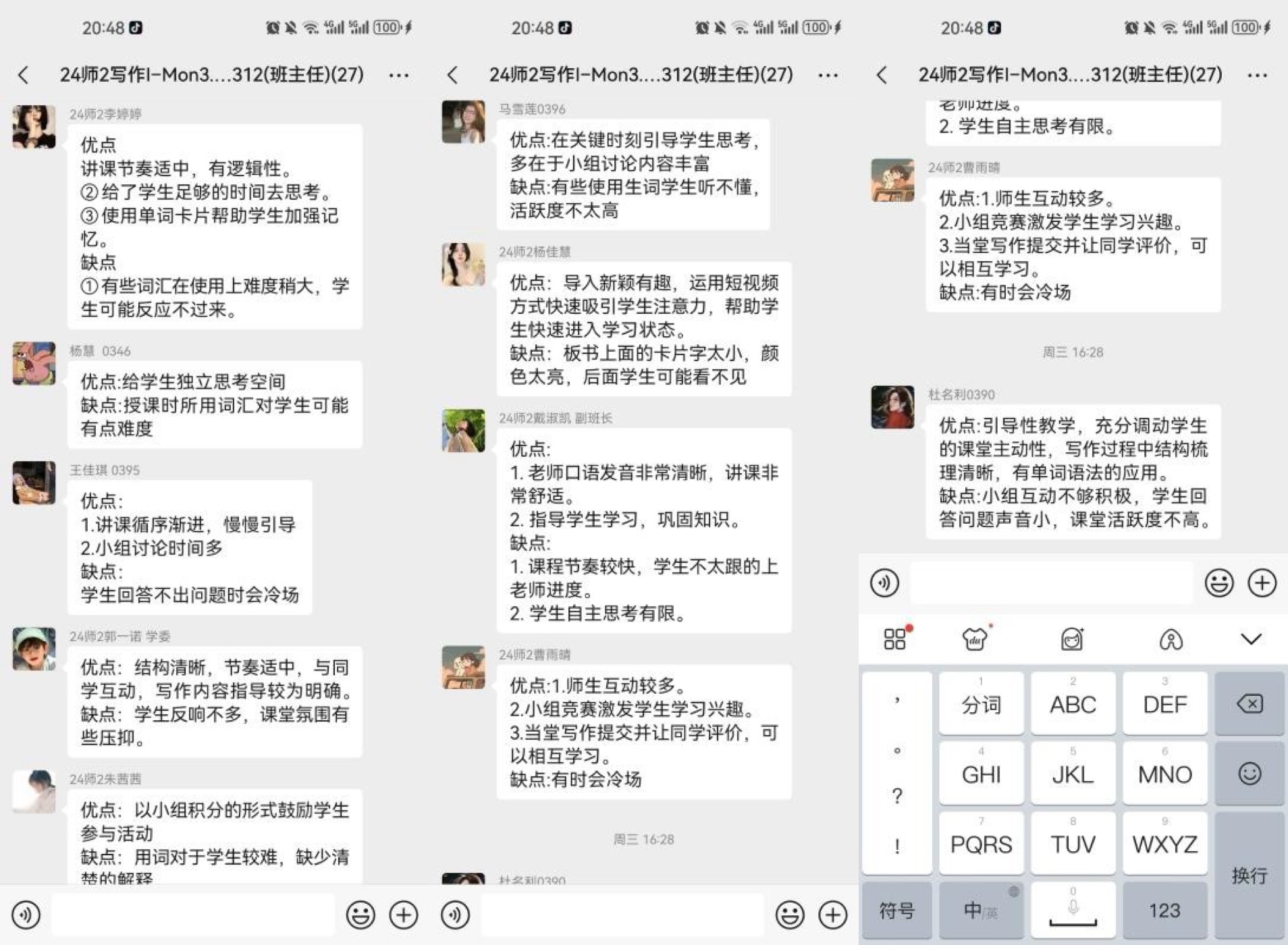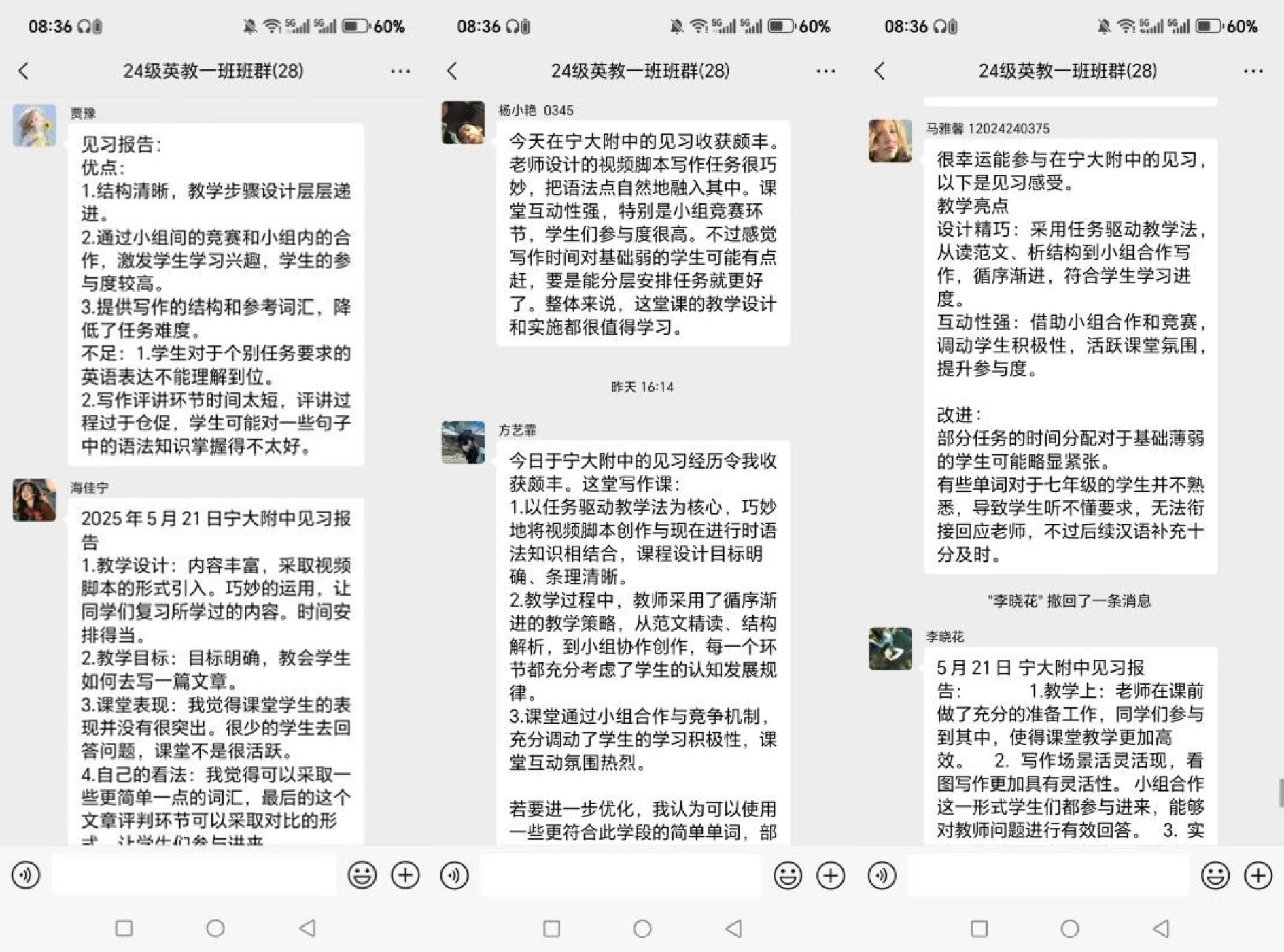 20名师范生认真观察并记录学习内容,课程互动和生生互评环节让大家眼前一亮。通过本次见习活动,师范生认识到师生之间的互动和意义协商是课堂学习的关键,同时教师评价与学生互评相结合更能为学生提供支持性的学习‘支架’,帮助学生跨越沟通的‘最近发展区’,积极参与,积极反思。见习活动结束后,师范生们对本次见习活动反馈如下: