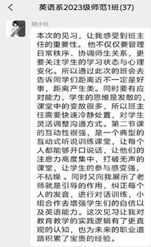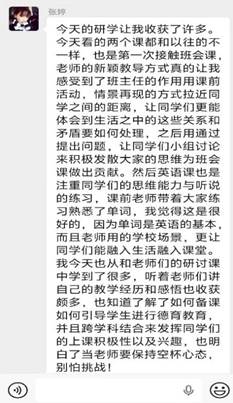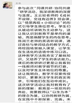 最令师范生感触深的是教研活动环节。在纳老师领学师德师风和新课标的相关文件后,七年级备课组长梁老师介绍了集体备课的经验和成果。在对陈润兰老师的展示课评课过程中,其他老师的点评真诚且有针对性,提出的五点建议让师范生看到一节课多次打磨后依然有提高的空间。kk体育 师生积极参与研讨,Smith博士肯定了课堂活动的效果,李艳、牛林琳、于成龙、徐哲四位师范生也现场分享了这次见习的收获与感悟。