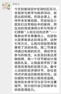通过在宝湖校区的现场研讨和紧随其后的班级反思反馈,师范生对课堂细节的关注与把握、教学效果观察、活动时间分配有了更直观的感受和深刻认识;研讨也激发了他们对教学理论的指导与创造性应用的认真思考。