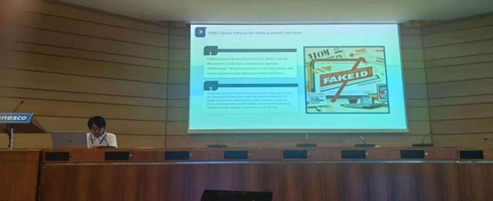 (赵云赫同学围绕“当人工智能生成的假新闻来袭:年轻人如何构建信息防火墙”进行发言。)