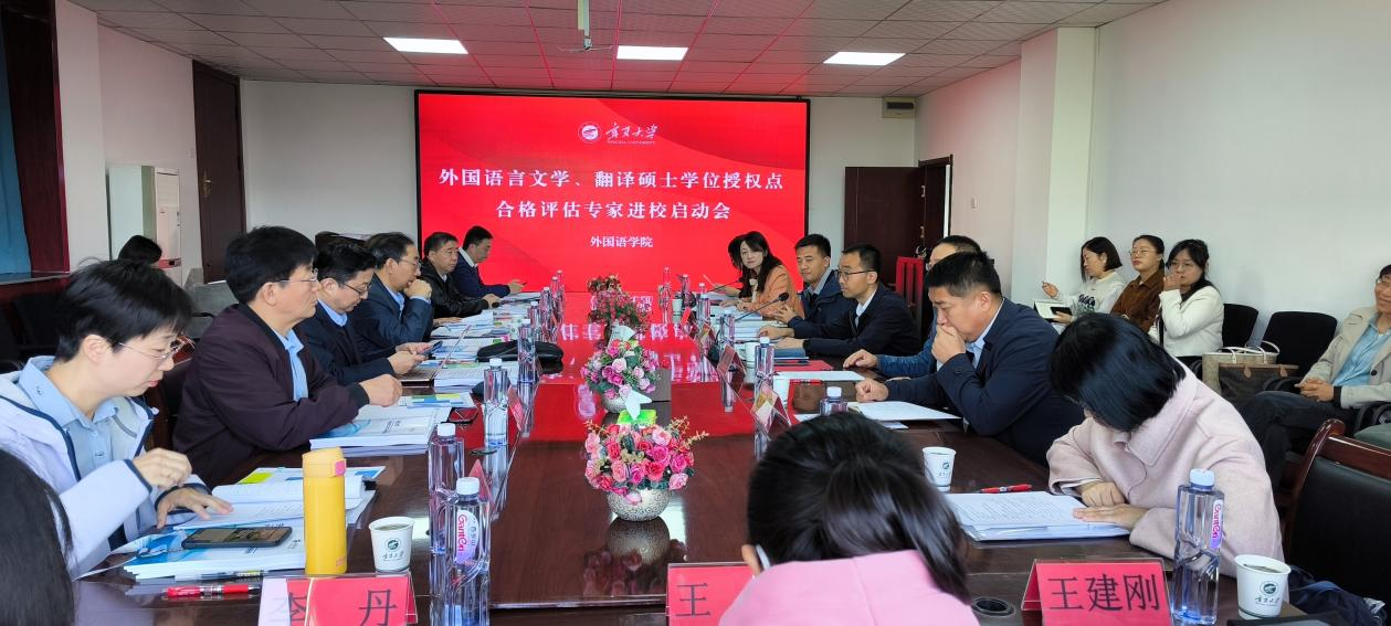 外国语言文学(0502)、翻译硕士(0551)学位授权点专家进校评审工作在怀远校区逸夫楼进行。本次评估组由上海交通大学特聘教授、国务院学位委员会第八届学科评议组成员彭青龙教授担任专家组组长,成员有全国翻译专业学位研究生教育指导委员副主任委员、广东外语外贸大学高级翻译学院赵军峰教授、国务院外国语言文学学科评议组成员、中国人民大学“杰出学者”郭英剑教授、国务院外国语言文学学科评议组成员、北京航空航天大学kk体育