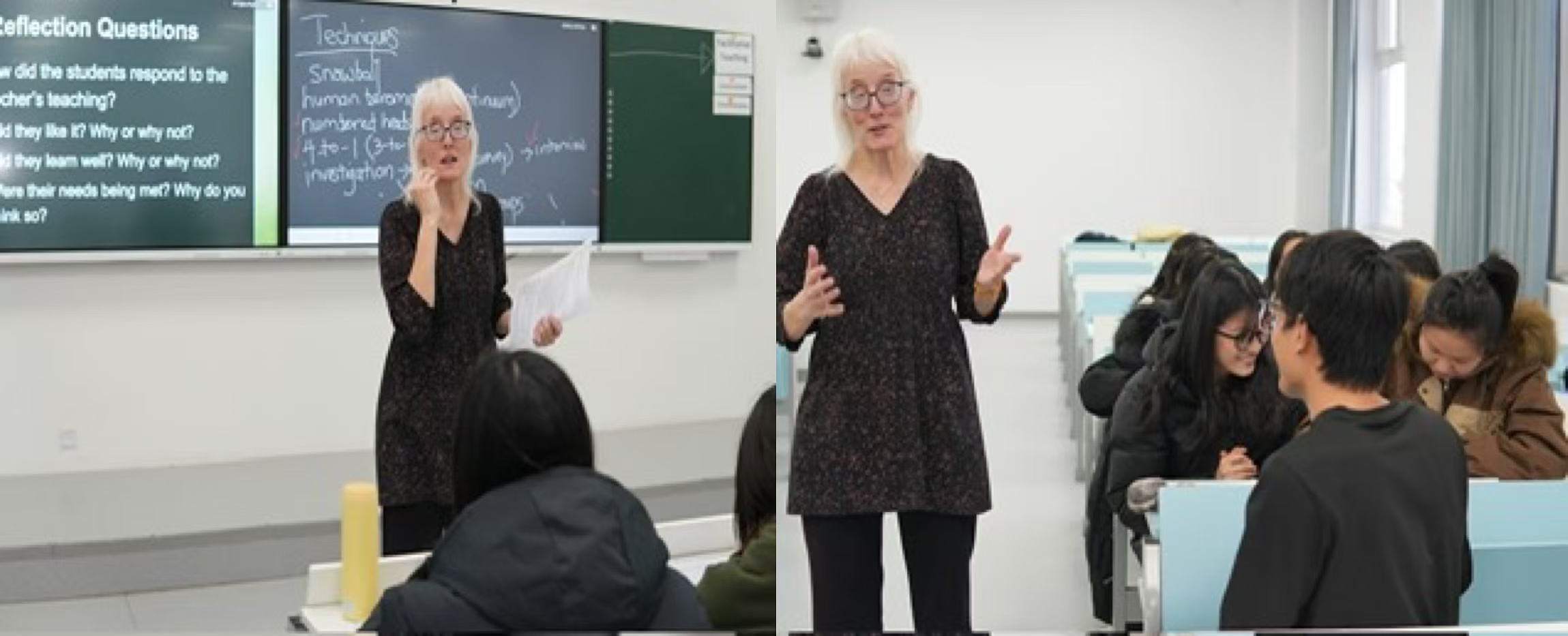 通过这一过程,同学们了解到如何用科学的方法收集、分析数据,以及如何用令人信服的方式展示自己的结论,体验了以研究者视角进行的课堂观摩反思。工作坊结束时,老师引导同学们将所学知识运用于实践:运用工作坊中学习的教学方法(human barometer or continuum, snowball, numbered heads together, 4-to-1, investigation, class poll or survey, visual design, or jigsaw/expert groups)设计教学活动,以帮助所观测课堂中的学生更好地掌握所学内容。